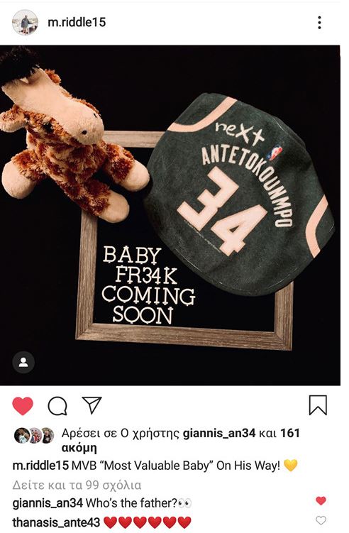 «Το πολυτιμότερο μωρό έρχεται» έγραψε η 27χρονη σύντροφος του MVP της περυσινής σεζόν στο ΝΒΑ, με τον «Giannis» να μη χάνει το χιούμορ του και να αναρωτιέται σε σχόλιο του «ποιος είναι ο πατέρας;», για να προσθέσει από κάτω δικό του σχόλιο ο Θανάσης Αντετοκούνμπο με αρκετές καρδούλες.