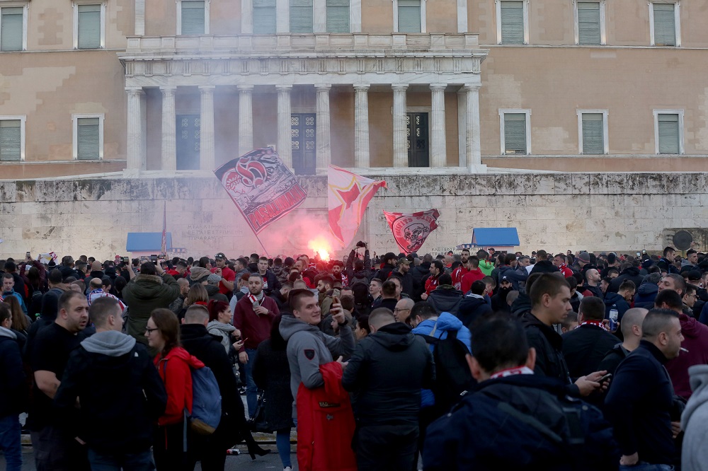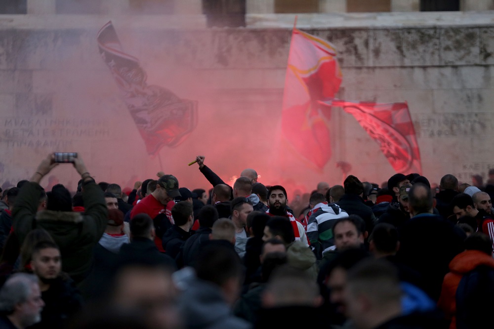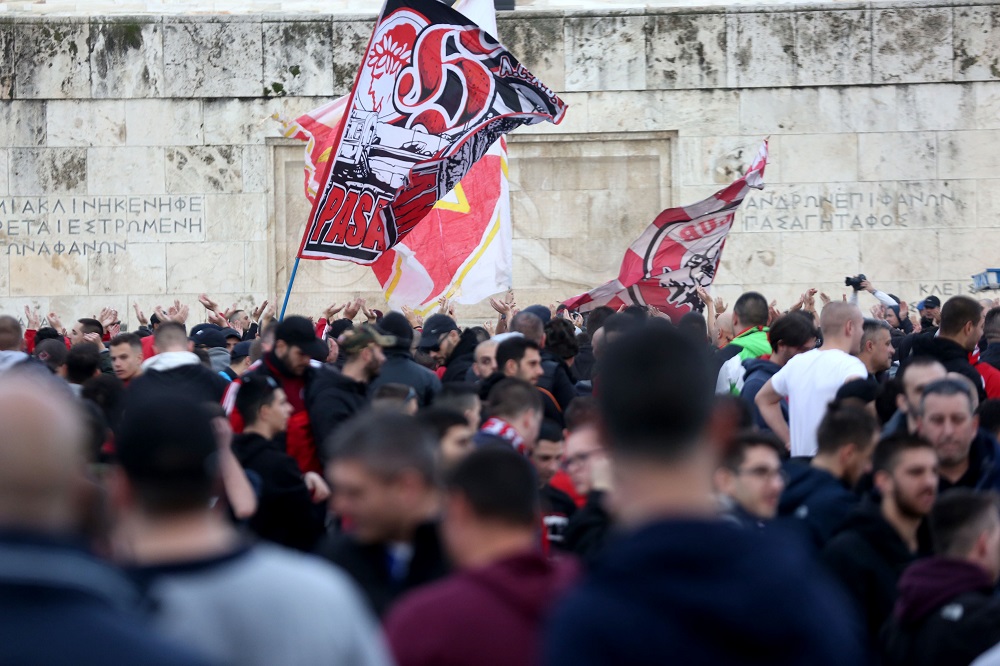 Oπαδοί των δύο ομάδων, με καπνογόνα, συγκεντρώθηκαν αρχικά στην πλατεία Συντάγματος και ανέβηκαν στο Μνημείο του Άγνωστου Στρατιώτη, μπροστά από το κτίριο της Βουλής.