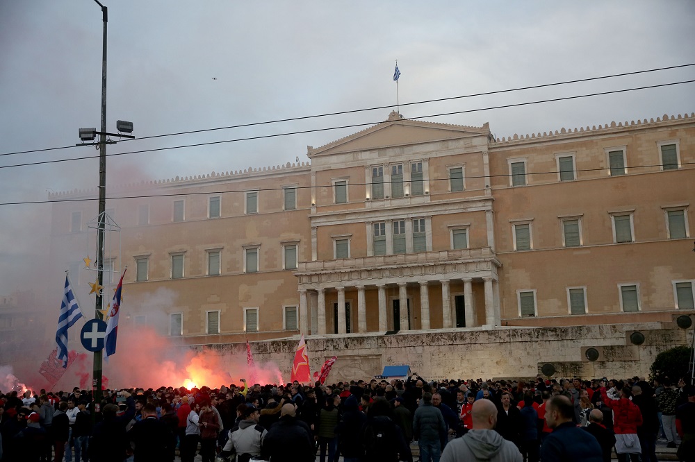 Τις εξαιρετικές σχέσεις τους επιβεβαίωσαν οι οπαδοί του Ολυμπιακού και του Ερυθρού Αστέρα, πραγματοποιώντας κοινή συγκέντρωση στην πλατεία Συντάγματος, νωρίς το απόγευμα της Τετάρτης, λίγες ώρες πριν τη σέντρα (22:00) του κρίσιμου αγώνα ανάμεσα στις δύο ομάδες στο γήπεδο «Γ. Καραϊσκάκης», στο πλαίσιο της 6ης αγωνιστικής του Β΄ ομίλου στο Champions League.