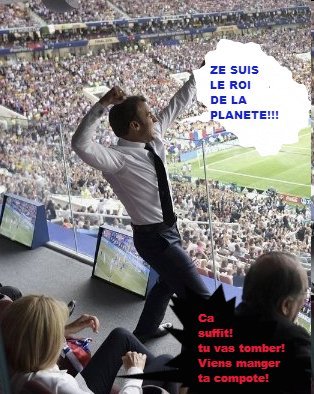 [Εδώ ο Μακρόν λέει «Είμαι ο βασιλιάς του πλανήτη» και η Μπριζίτ Μακρόν, πίσω του, απαντά «Αρκετά! Θα πέσεις! Ελα να φας την κομπόστα σου»]: