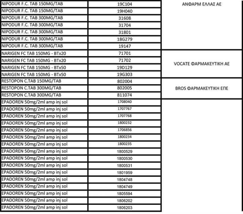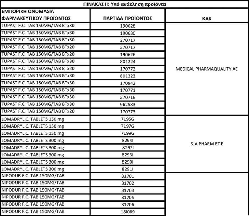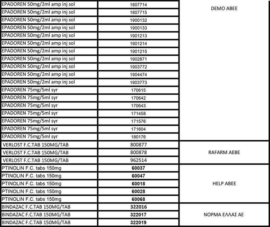 Αναλυτικά τα σκευάσματα που ανακαλούνται αναγράφονται στον ακόλουθο πίνακα: