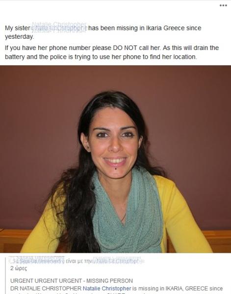 Την ώρα που συνεχίζονται οι έρευνες στην Ικαρία –δυστυχώς χωρίς κάποιο θετικό αποτέλεσμα– η αδερφή της, με μια ανάρτηση στο facebook ζητάει και εκείνη, αν κάποιος γνωρίζει κάτι για την υπόθεση, να επικοινωνήσει με τις αρχές.