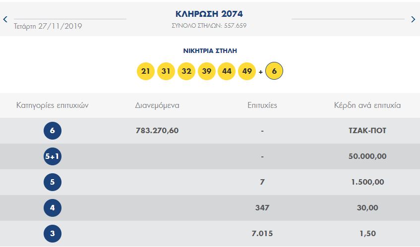 Πραγματοποιήθηκε το βράδυ της Τετάρτης 27 Νοεμβρίου η κλήρωση 2074 του ΛΟΤΤΟ, του τυχερού παιχνιδιού του ΟΠΑΠ.