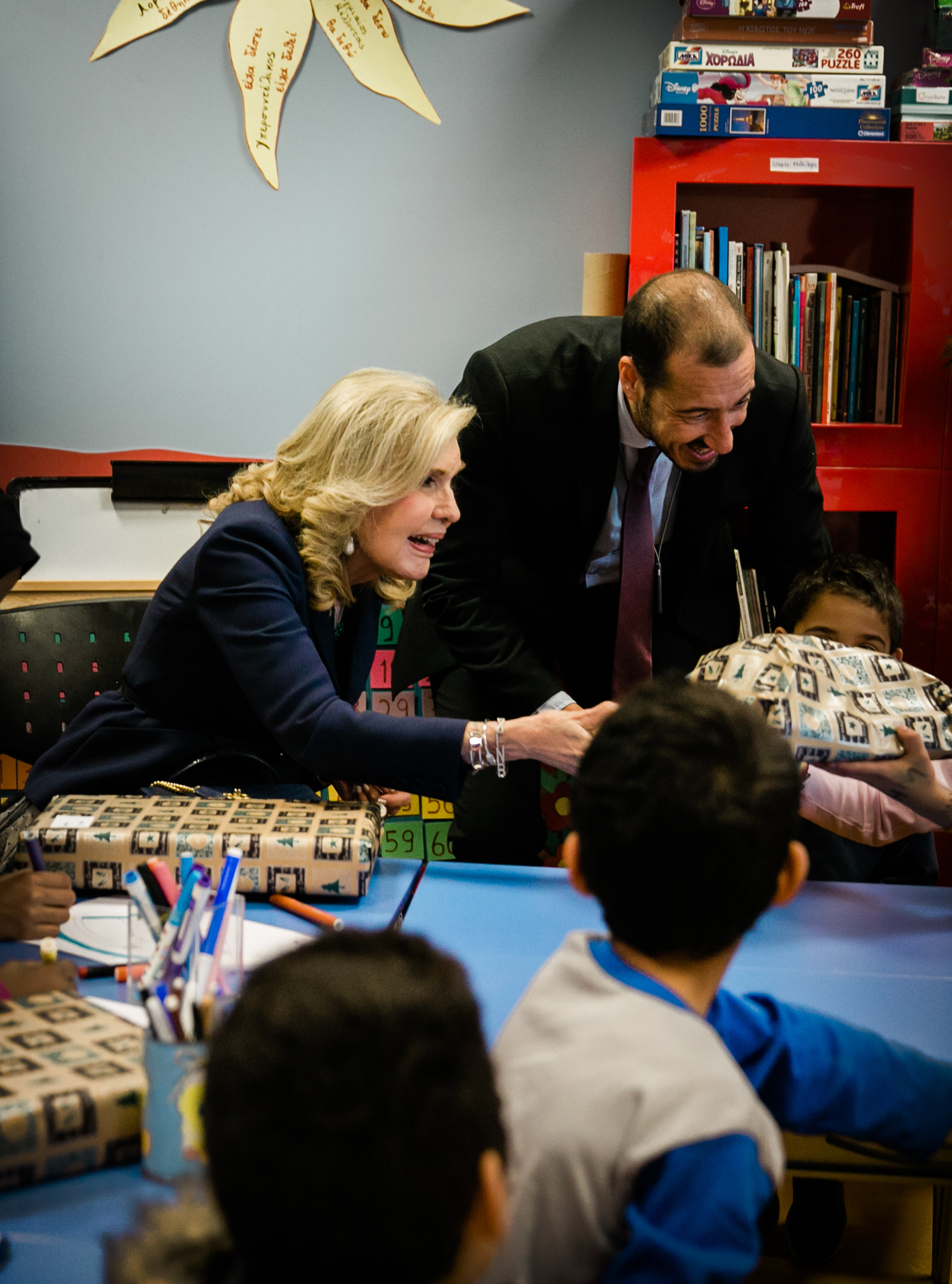 «Αγαπημένα μου παιδιά είμαι πολύ συγκινημένη που βρίσκομαι κοντά σας σήμερα. Θέλω να ευχηθώ σε όλους σας Καλά Χριστούγεννα. Να είστε δυνατοί και να μην χάνετε ποτέ την ελπίδα σας. Ο Θεός φροντίζει για όλους. Θέλω να ξέρετε πως εγώ είμαι πάντα κοντά σας» είπε η κυρία Βαρδινογιάννη απευθυνόμενη στα παιδιά.