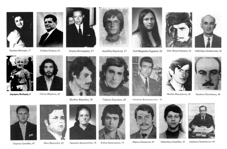 23. Ευστάθιος Κολινιάτης, 47 ετών, από τον Πειραιά, κάτοικος Νικο-πόλεως 4, Καματερό Αττικής. Κτυπήθηκε στις 18.11.1973 από αστυνομικούς με συμπαγείς ράβδους, και υπέστη κρανιοεγκεφαλικές κακώσεις, συνεπεία των οποίων πέθανε στις 21.11.1973.