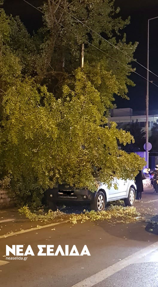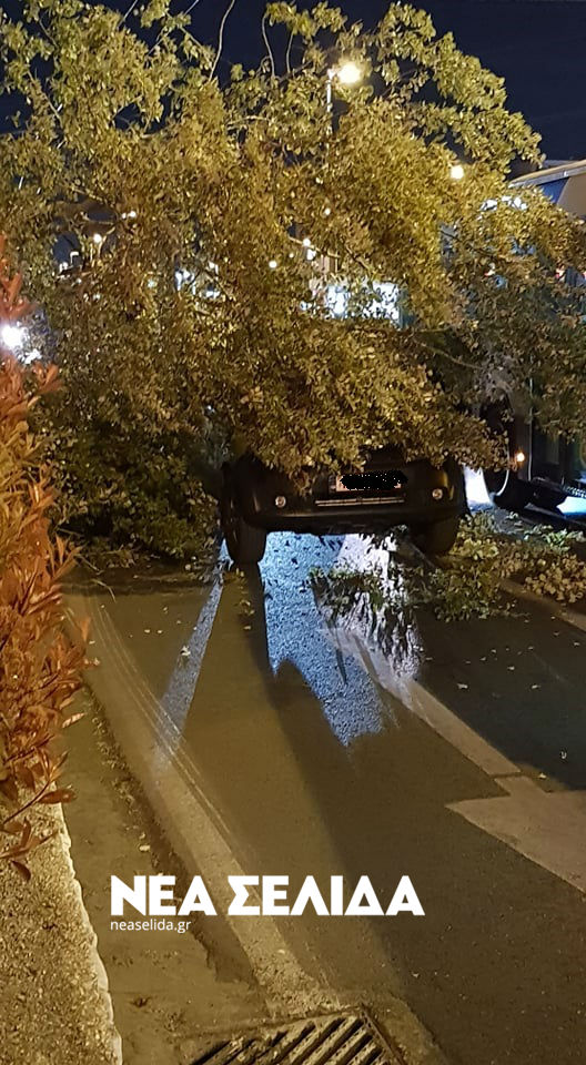Το ΙΧ ήταν σταματημένο στο φανάρι, στο σημείο όπου υπάρχει κατάστημα γνωστής αλυσίδας σούπερ μάρκετ. Ξαφνικά ένα δέντρο από παρακείμενο πάρκο έπεσε πάνω στο αυτοκίνητο, μπροστά στα έντρομα μάτια του οδηγού.