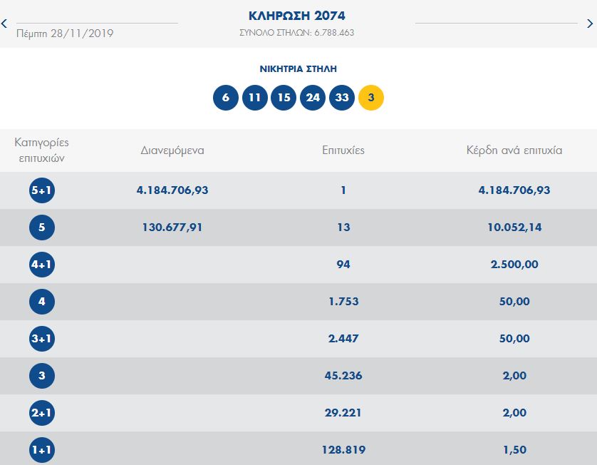 Πραγματοποιήθηκε το βράδυ της Πέμπτης 28 Νοεμβρίου 2019, η κλήρωση (2074) του Τζόκερ, του τυχερού παιχνιδιού του ΟΠΑΠ.
