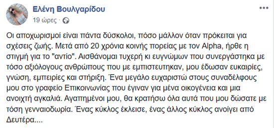 «Οι αποχωρισμοί είναι πάντα δύσκολοι, πόσο μάλλον όταν πρόκειται για σχέσεις ζωής. Μετά από 20 χρόνια κοινής πορείας με τον Alpha, ήρθε η στιγμή για το «αντίο». Αισθάνομαι τυχερή κι ευγνώμων που συνεργάστηκα με τόσο αξιόλογους ανθρώπους που με εμπιστεύτηκαν, μου έδωσαν ευκαιρίες, γνώση, εμπειρίες και στήριξη. Ένα μεγάλο ευχαριστώ στους συναδέλφους μου στο γραφείο Επικοινωνίας που έγιναν για μένα οικογένεια και μια ανοιχτή αγκαλιά. Αγαπημένοι μου, θα κρατήσω όλα αυτά που μου δώσατε με τόση γενναιοδωρία. Ένας κύκλος έκλεισε, ένας άλλος κύκλος ανοίγει από Δευτέρα…», έγραψε.