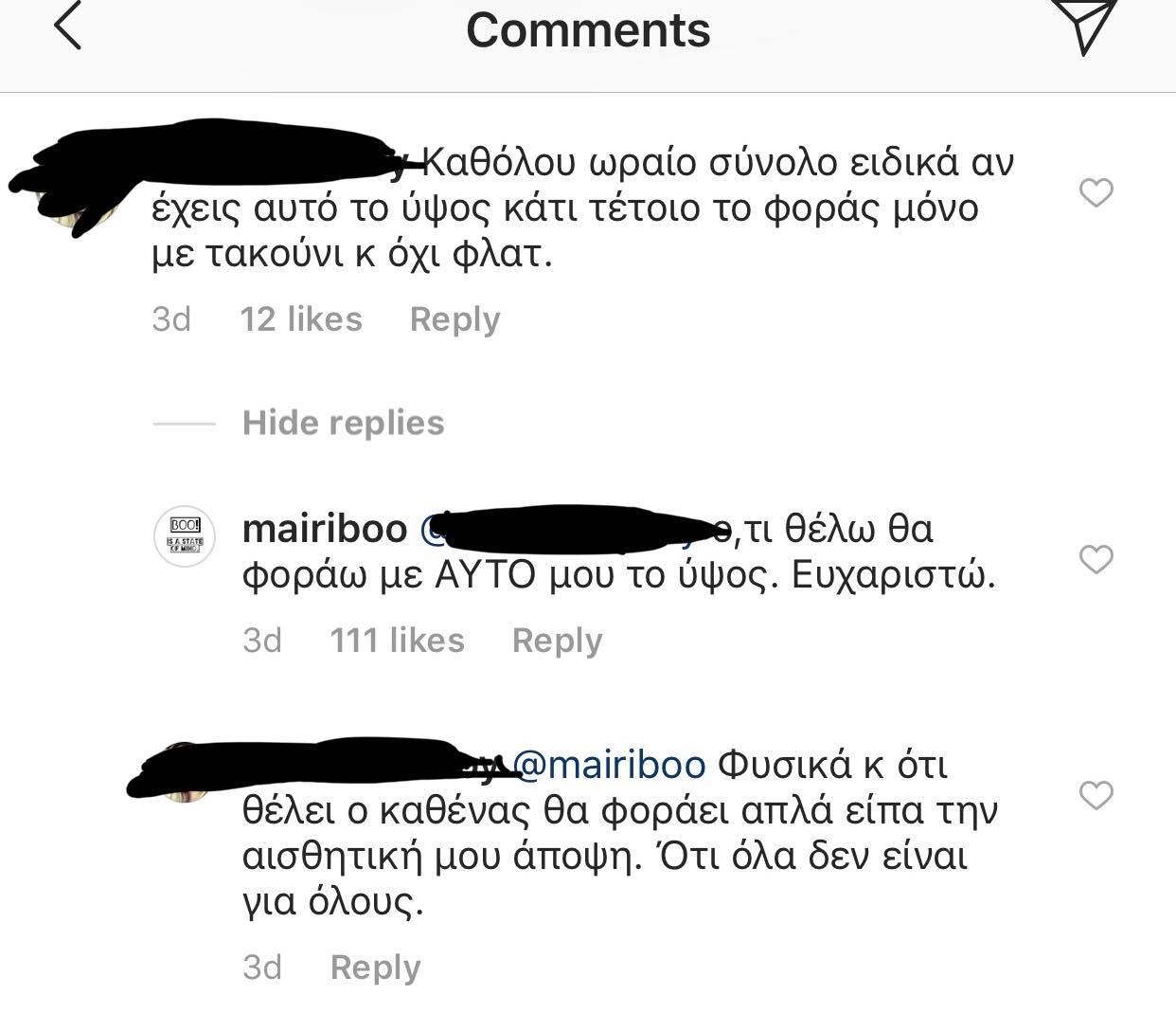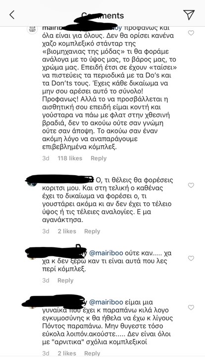 Οι δημοσιεύσεις αυτές όμως, στάθηκαν αφορμή για να λάβει αρκετά αρνητικά σχόλια σχετικά με το ντύσιμο της, αλλά και το παρουσιαστικό της γενικότερα. Συγκεκριμένα, δεν ήταν λίγοι αυτοί που σχολίασαν κάτω από τις φωτογραφίες ότι αυτό που είχε επιλέξει να φορέσει δεν ήταν ωραίο ή ότι δεν το είχε συνδυάσει σωστά. Εκείνο όμως που έκανε την παρουσιάστρια να αντιδράσει, ήταν τα σχόλια που αφορούσαν το ύψος της, καθώς όπως υποστήριξαν δεν έχει το κατάλληλο ύψος για να φορέσει κάτι τέτοιο με φλατ παπούτσι, και επειδή -όπως ουσιαστικά υπονοήθηκε- είναι κοντή θα μπορούσε να το αναδείξει μόνο με ψηλοτάκουνα.