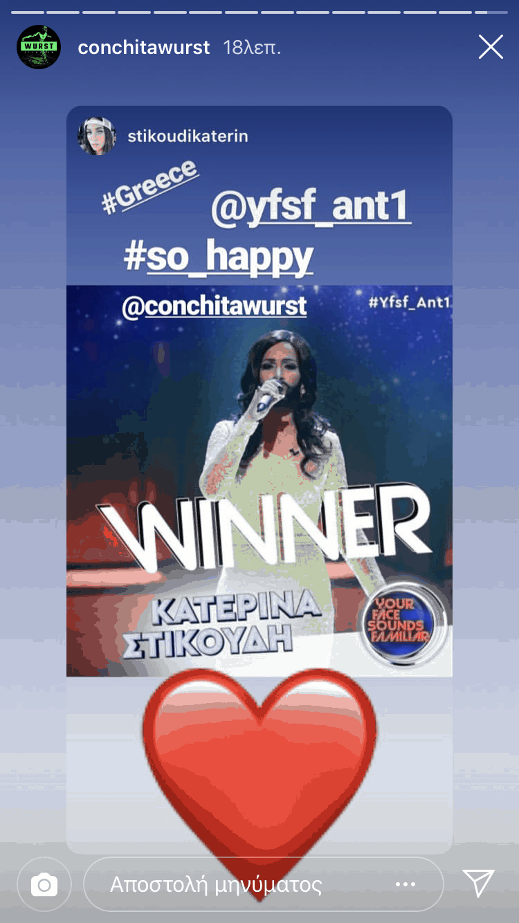 Η Κατερίνα Στικούδη εντυπωσίασε με τη μίμησή της και ξεχώρισε στο YFSF. Μάλιστα από την ερμηνεία της εντυπωσιάστηκε και η ίδια η Κοντσίτα, η οποία αναδημοσίευσε στο Instagram τη φωτογραφία της Κατερίνας, προσθέτοντας μία μεγάλη καρδιά και σχολιάζοντας «Τόσο χαρούμενη».