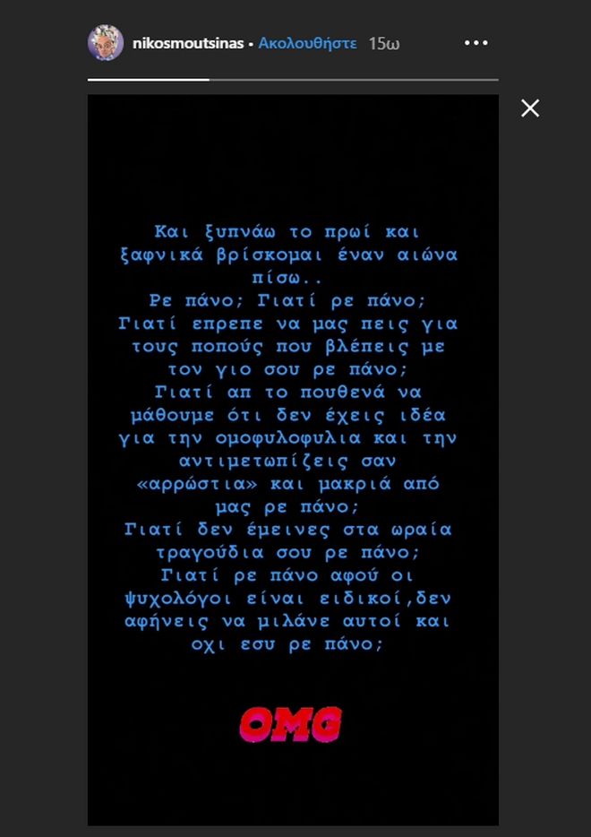 Τις ομοφοβικές δηλώσεις του Πάνου Καλίδη σχολίασε ο Νίκος Μουτσινάς με ανάρτησή του στα stories του προσωπικού του λογαριασμού στο Instagram.
