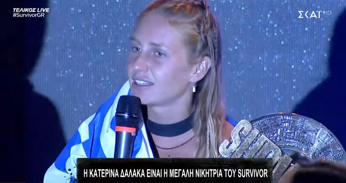 Μεγάλη νικήτρια του φετινού Survivor, του ριάλιτι επιβίωσης του ΣΚΑΪ, αναδείχθηκε η Κατερίνα Δαλάκα, κερδίζοντας το χρηματικό έπαθλο των 100.000 ευρώ.