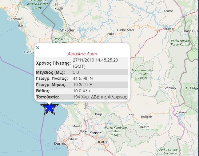 Το επίκεντρο εντοπίζεται 42 χλμ βορειοδυτικά των Τιράνων και 24 χλμ βόρεια του Δυρραχίου.