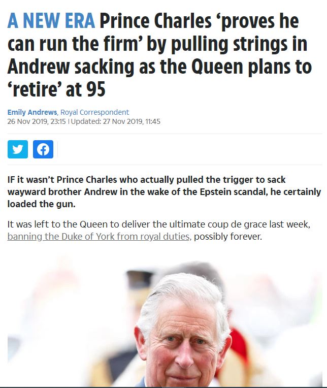 Σύμφωνα με το δημοσίευμα, η βασίλισσα Ελισάβετ έχει αποφασίσει να παραιτηθεί και ο πρωτότοκος γιος της, πρίγκιπας της Ουαλίας Κάρολος, ετοιμάζεται να την διαδεχθεί στον θρόνο.