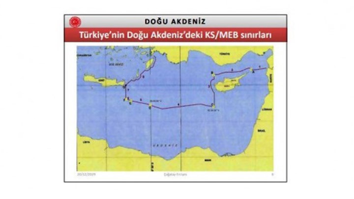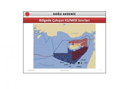 Στην επόμενη σελίδα παρουσιάζεται χάρτης με όλα τα τεμάχια, όπως τα έχει χωρίσει η Τουρκία και το ψευδοκράτος, καλύπτοντας σχεδόν όλη την περιοχή της Ανατολικής Μεσογείου. Στον χάρτη του τουρκικού υπουργείου Εξωτερικών δεν αναγνωρίζονται η υφαλοκρηπίδα της Κύπρου και του Καστελόριζου.