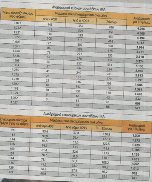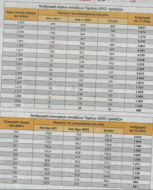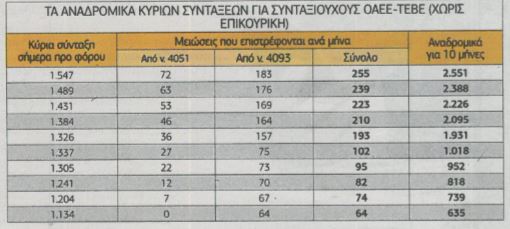 Αναδρομικά κύριων συντάξεων ως 8.627 ευρώ για συνταξιούχους ΔΕΚΟ και τραπεζών, ως 4.956 ευρώ για συνταξιούχους του ΙΚΑ και ως 2.550 ευρώ για συνταξιούχους του ΟΑΕΕ προερχόμενους κυρίως από το ΤΕΒΕ, βγάζει το 10μηνο των επιστροφών από τις παράνομες μειώσεις των νόμων 4051 και 4093.