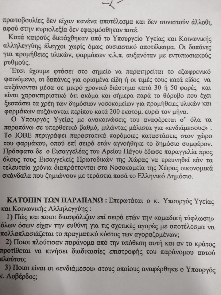 Με ανάρτησή του στο προσωπικό του προφίλ στο facebook ο αναπληρωτής υπουργός Υγείας, Παύλος Πολάκης, παρουσιάζει έγγραφα από επίκαιρη ερώτηση που είχαν υποβάλει βουλευτές το 2011 στον τότε υπουργό Υγείας Ανδρέα Λοβέρδο, σχετικά με τις προμήθειες και την κατασπατάληση στον τομέα της υγείας, και στην οποία υπήρχαν εκφράσεις όπως «τρωκτικά» και «πιράνχας».