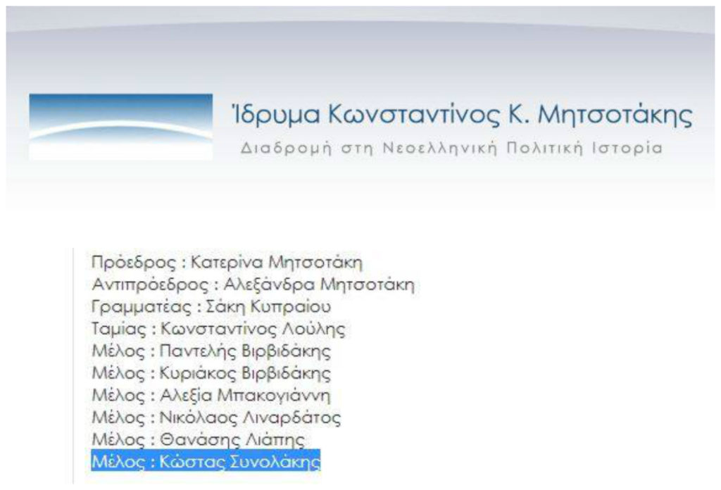 Ο καθηγητής Συνολάκης, τον οποίο με τόσο πάθος επικαλούνται τα στελέχη της Νέας Δημοκρατίας, όχι μόνο είναι κουμπάρος του Κυριάκου Μητσοτάκη και μέλος του Ιδρύματος Μητσοτάκη, αλλά συν-έτρωγε στο ανακαινισμένο σπίτι του Μητσοτάκη, ανάμεσα σε πλήθος καλεσμένων (πολιτικών, δημοσιογράφων κλπ) λίγες εβδομάδες μετά την τραγωδία στο Μάτι, τα ντολμαδάκια της Μαρίκας τα οποία τα σέρβιρε η Μαρέβα Γκραμπόβσκι αλλά είχε παρασκευάσει η Έμμα, η Φιλιππινέζα που πέρασε τη ζωή της με τη Μαρίκα και τον Κωνσταντίνο Μητσοτάκη.