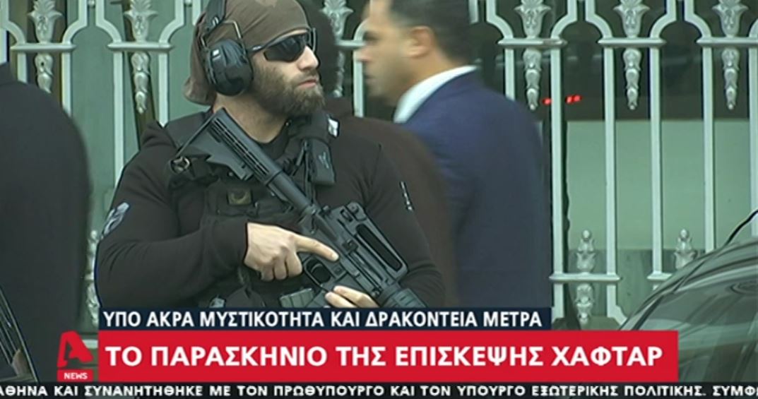 Δρακόντεια τα μέτρα και σήμερα το πρωί πριν την αναχώρηση του Χαλίφα Χαφτάρ για τις επίσημες συναντήσεις του. Μάλιστα, σκυλί της αστυνομίας ελέγχει το αυτοκίνητό του, ενώ πάνοπλοι άνδρες τον συνοδεύουν.