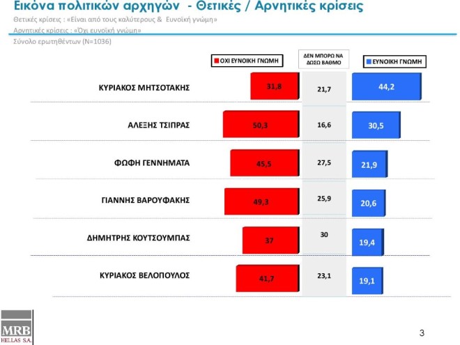 Με το ίδιο ακριβώς ποσοστό (19,7) προηγείται ο κ. Μητσοτάκης του κ. Τσίπρα και στις ευνοϊκές γνώμες (44,2% για τον νυν πρωθυπουργού έναντι 30,5% του προκατόχου του).