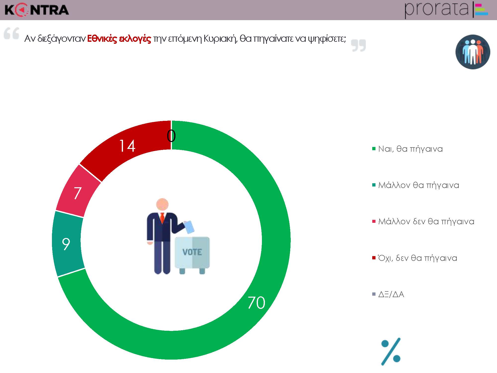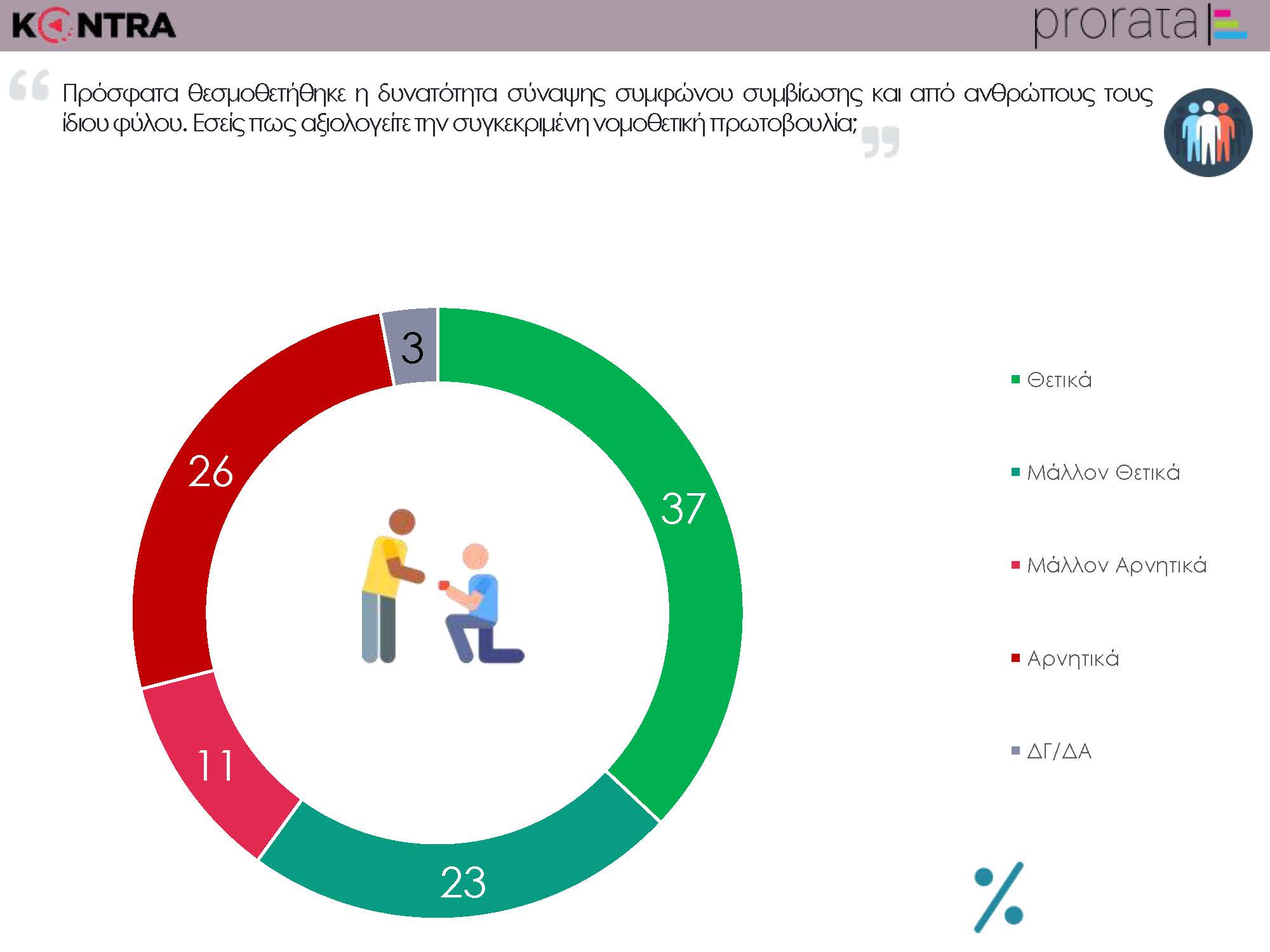 Δημοσκόπηση Prorata για το Kontra Channel: 4,5 μονάδες η ψαλίδα στους νέουςΔημοσκόπηση της Prorata παρουσίασε απόψε το κεντρικό δελτίο ειδήσεων του Kontra Channel. Τα βασικότερα σημεία της μέτρησης της εταιρείας, που απευθύνθηκε σε νέους ως 34 ετών, είναι: – 4,5 μονάδες η ψαλίδα (24% ΝΔ, 19,5% ΣΥΡΙΖΑ, 4% ΚΙΝΑΛ, 0% ΑΝΕΛ)- 74%: θετική η κατάργηση του υποκατώτατου μισθού (24%: αρνητική)- 49%: από δω και πέρα η οικονομία θα πάει καλύτερα (47%: χειρότερα)- 71%: θετικοί στη νομιμοποίηση κάναβης για φαρμακευτικούς λόγους (26%: αρνητικοί)- 40%: θετικοί στη νομιμοποίηση της κάναβης για ψυχαγωγικούς λόγους (59%: αρνητικοί)- 60%: θετικοί στο σύμφωνο συμβίωσης (37%: αρνητικοί)- 48%: θετικοί στην ταυτότητα φύλου (48%: αρνητικοί)- 49%: θετικοί στο διαχωρισμό Κράτους-Εκκλησίας (48%: αρνητικοί)- 79%: θα πάω να ψηφίσω (21%: δεν θα πάω να ψηφίσω)