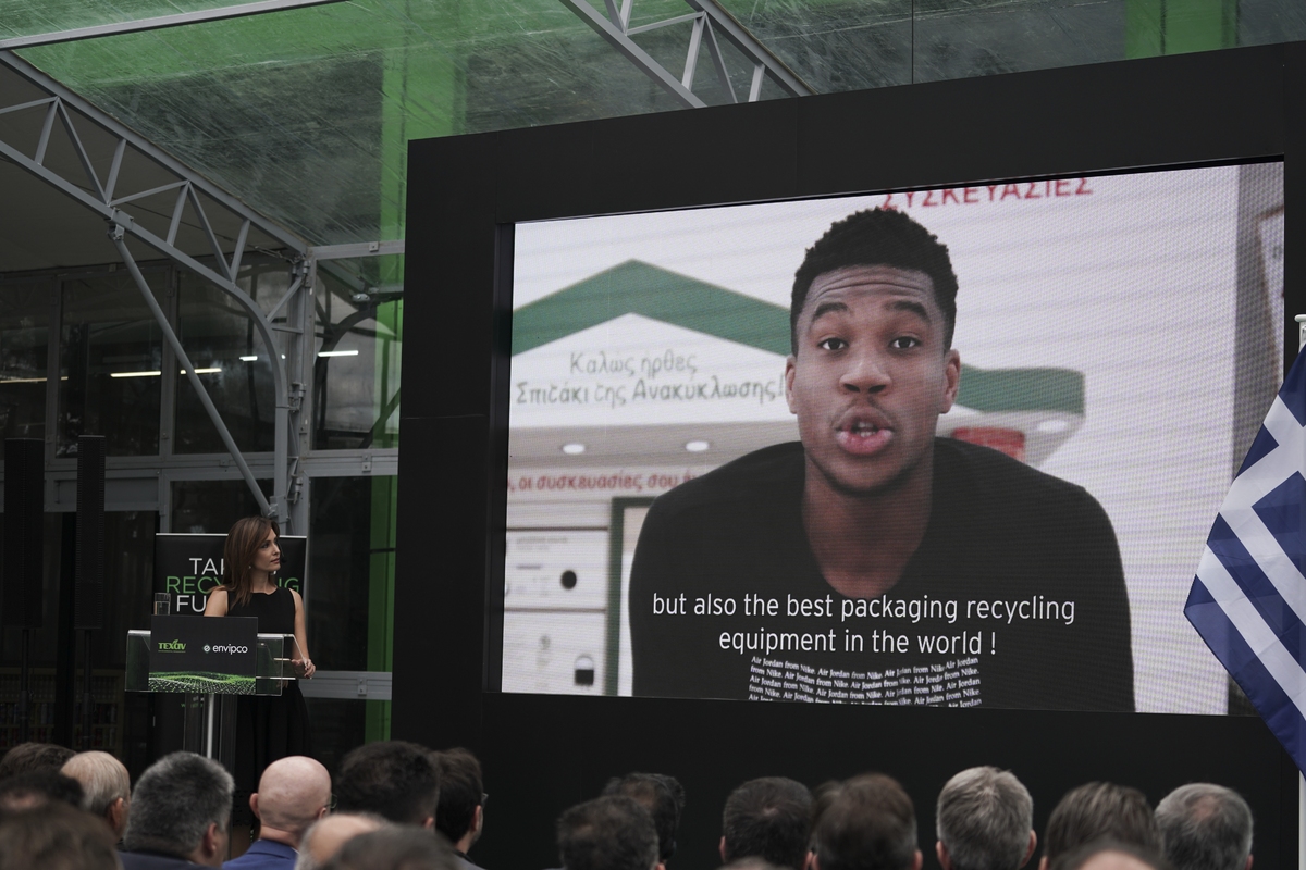 Πριν από την ομιλία του πρωθυπουργού μεταδόθηκε βίντεο με το εξής μήνυμα του καλαθοσφαιριστή και πρεσβευτή της ανταποδοτικής ανακύκλωσης, Γιάννη Αντετοκούμπο: «Είναι ιδιαίτερη χαρά μου που τα υψηλής τεχνολογίας μηχανήματα ανακύκλωσης που χρησιμοποιεί το εθνικό συλλογικό σύστημα ανταποδοτικής ανακύκλωσης, είναι εξοπλισμός αμερικάνικης τεχνολογίας. Ως αποτέλεσμα οι ΗΠΑ δεν έχουν μόνο το καλύτερο πρωτάθλημα μπάσκετ στον κόσμο αλλά και τον καλύτερο εξοπλισμό ανακύκλωσης στον κόσμο. Τώρα, πλέον, είμαι πιο ικανοποιημένος γιατί δημιουργήθηκε στην Ελλάδα η πρώτη μονάδα παραγωγής μηχανημάτων ανακύκλωσης υψηλής τεχνολογίας εκτός των συνόρων της Αμερικής, καθιστώντας την Ελλάδα κεντρικό κόμβο για όλη την Ευρώπη.