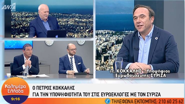 Καλεσμένος στην εκπομπή «Καλημέρα Ελλάδα» και στον Γιώργο Παπαδάκη στον ΑΝΤ1 βρέθηκε σήμερα ο υποψήφιος του ΣΥΡΙΖΑ για τις Ευρωεκλογές 2019 και εκπρόσωπος της πολιτικής κίνησης «ΚΟΣΜΟΣ», Πέτρος Κόκκαλης.