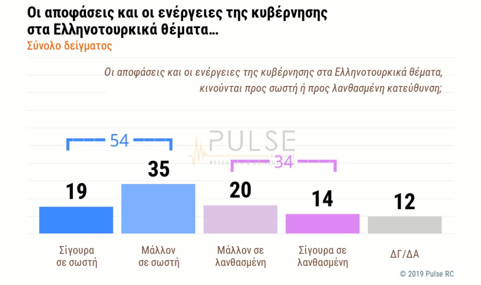 Το 54% συνολικά των ερωτηθέντων δηλώνουν ότι οι αποφάσεις της κυβέρνησης στα ελληνοτουρκικά κινούνται σίγουρα σε σωστή κατεύθυνση (19%) ή μάλλον σε σωστή κατεύθυνση (35%), ενώ το 34% συνολικά απαντούν ότι οι αποφάσεις κινούνται μάλλον σε λανθασμένη (20%) ή σίγουρα σε λανθασμένη κατεύθυνση (14%), ενώ το 12% δηλώνει δεν ξέρω/ δεν απαντώ.