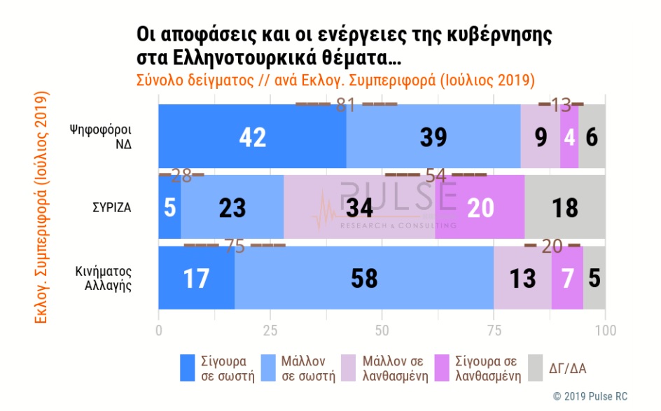 Παράλληλα, συνολικά το 81% των εκλογέων της ΝΔ δηλώνουν ότι οι αποφάσεις και οι ενέργειες της κυβέρνησης στα ελληνοτουρκικά θέματα είναι σίγουρα σε σωστή (42%) ή μάλλον σε σωστή (39%) κατεύθυνση, συνολικά το 13% μάλλον σε λανθασμένη (9%) ή σίγουρα σε λανθασμένη (4%) κατεύθυνση, ενώ 6% απαντά δεν γνωρίζω/ δεν απαντώ.