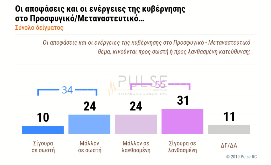 Αντίθετα, η κοινή γνώμη εμφανίζεται επιφυλακτική για το προσφυγικό/ μεταναστευτικό, με τρεις στους 10 Έλληνες να επιδοκιμάζουν την κυβερνητική πολιτική.