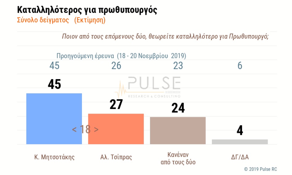 Το 45% των ερωτώμενων θεωρεί ως καταλληλότερο για πρωθυπουργό τον Κυριάκο Μητσοτάκη (45% και στην προηγούμενη δημοσκόπηση), ενώ το 27% τον Αλέξη Τσίπρα (από 26%) με τη διαφορά να φθάνει το 18%. Το 24% δηλώνει ότι δεν θεωρεί καταλληλότερο ως πρωθυπουργό κανέναν από τους δύο. 4% δηλώνει δεν γνωρίζω/ δεν απαντώ.