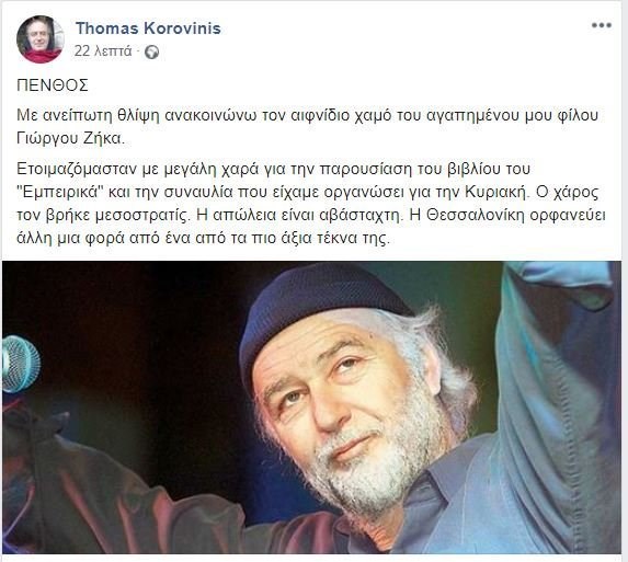 Την είδηση του θανάτου ανακοίνωσε μέσω Facebook η έτερη σπουδαία μορφή του πνεύματος, των γραμμάτων και της μουσικής στη Θεσσαλονίκη, ο Θωμάς Κοροβίνης, που ανακοίνωσε με θλίψη την απώλεια του Γιώργου Ζήκα.